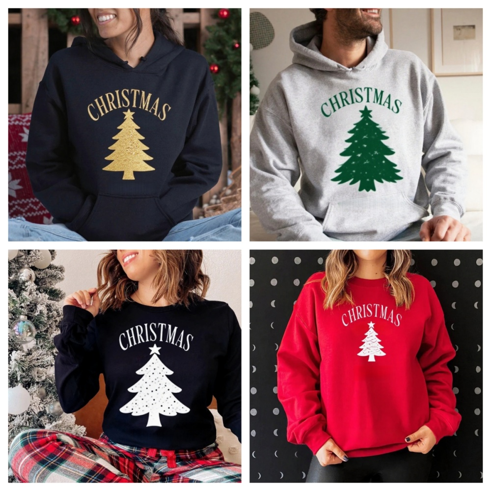 These sweatshirt are made of soft and breathable cotton fabric, perfectly blending comfort and festive charm,you can choose a navy blue hoodie with golden Christmas tree pattern letters, or a light gray one with a green Christmas tree pattern letter, or a black sweatshirt with a white Christmas tree pattern letter, or a red one with a white Christmas tree pattern; each color-patterned sweatshirt can add a relaxed and cheerful atmosphere to your family gathering. Wearing them is very suitable for taking family photos, attending holiday parties, or sitting in the living room eating snacks and watching TV on a cozy night. These sweatshirt come in various sizes suitable for people of all ages, including men, women and children. They ensure that the whole family can wear them. With comfortable fabric and simple yet sophisticated designs, they have become a beloved holiday essential for many years. This Christmas, let you and your family feel warmth and happiness.